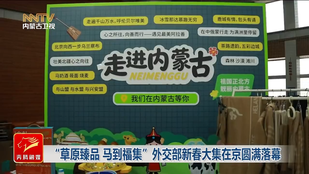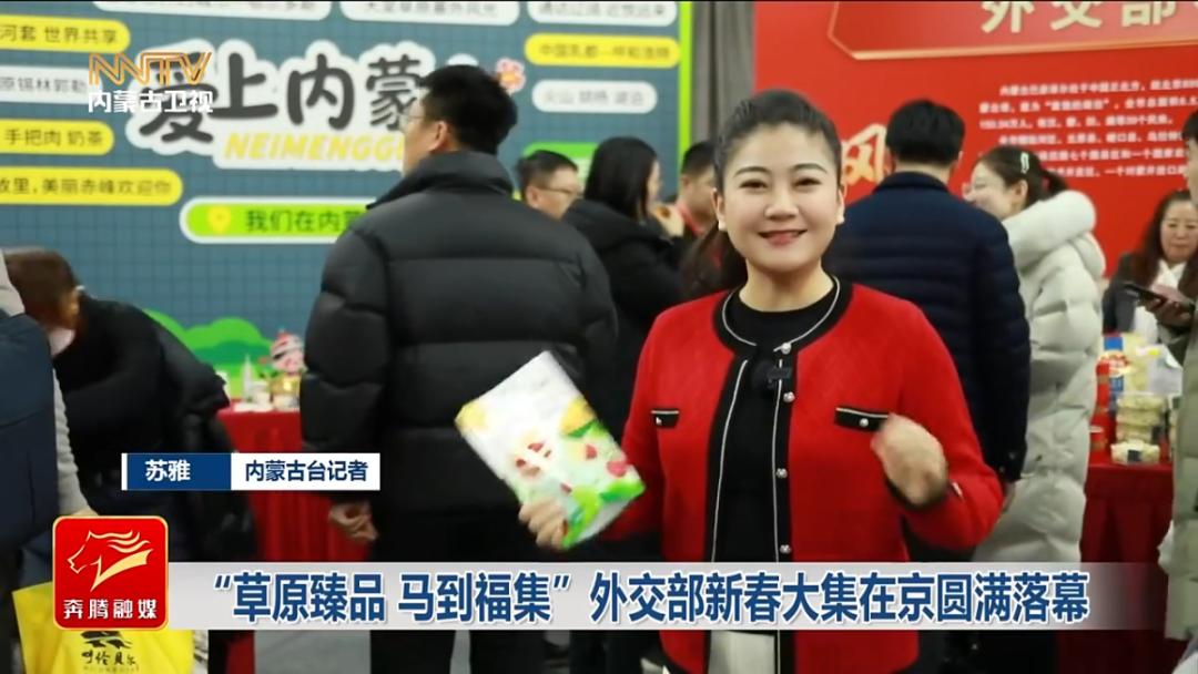 苏雅 内蒙古台记者 我现在是在外交部综合馆春节大集的现场,一来到这里就感觉到非常的热闹,年味儿扑面而来。奶制品飘香、肉干诱人,还有一些文创产品非常的吸睛。那么这也是我们内蒙古首次以“外事+”的形式参与到这样的活动当中来。
