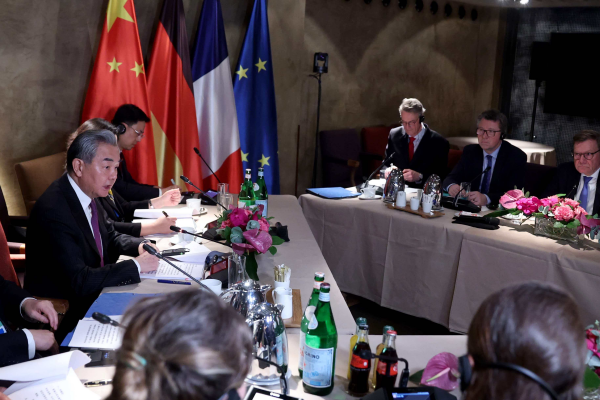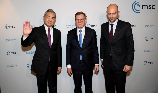 当地时间2026年2月13日,中共中央政治局委员、外交部长王毅在德国慕尼黑同德国外交部长瓦德富尔、法国外交部长巴罗举行三方外长会晤。